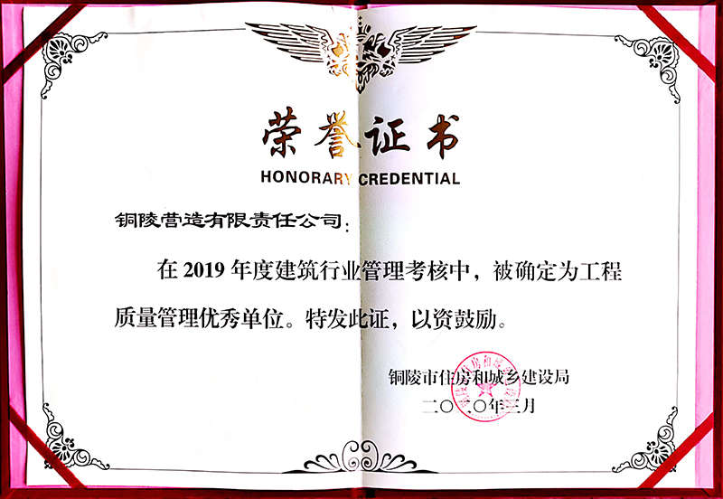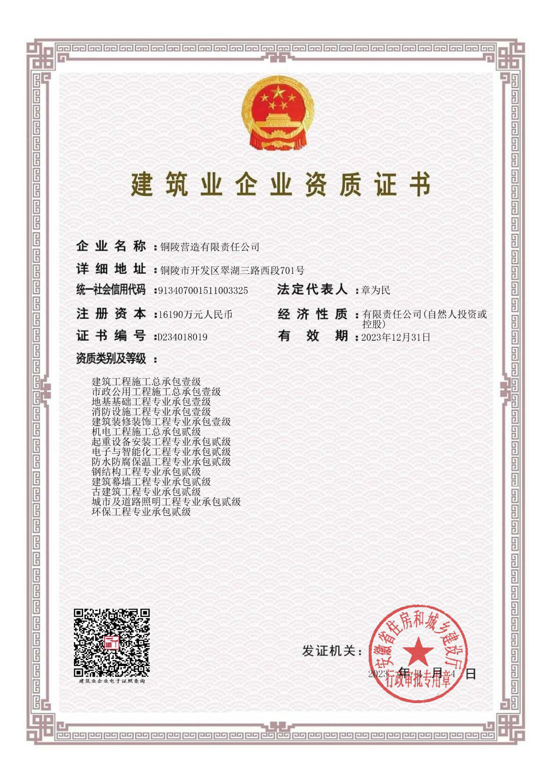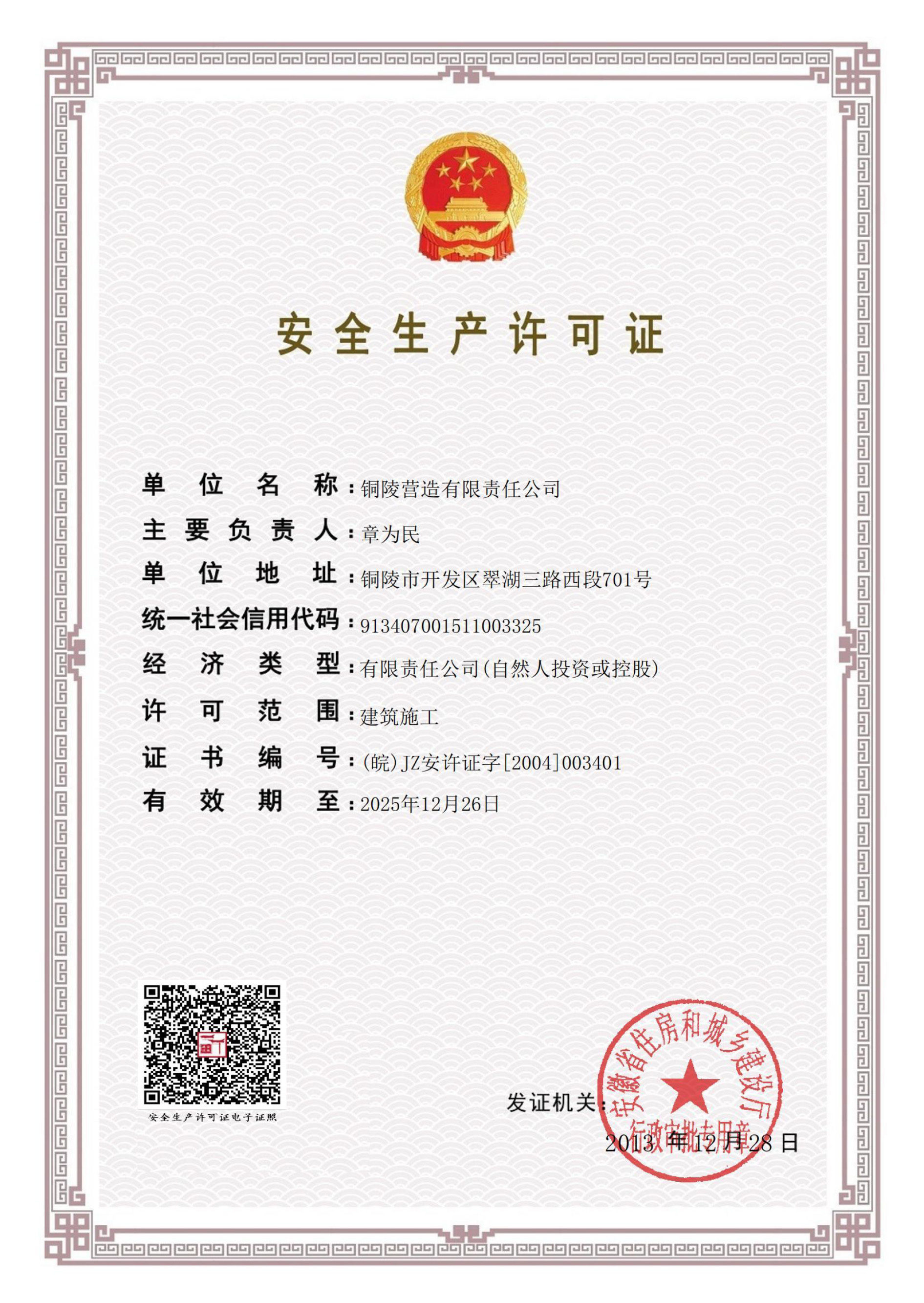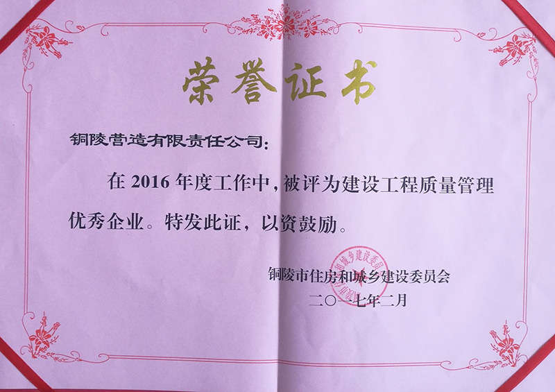 銅陵?duì)I造有限責(zé)任公司是國家住建部核準(zhǔn)的房屋建筑總承包一級企業(yè)。2006年7月,企業(yè)二次改制為民營企業(yè),并更名為“銅陵?duì)I造有限責(zé)任公司”。目前,公司擁有房建施工總承包、市政公用工程總承包、鋼結(jié)構(gòu)專業(yè)工程承包、建筑裝修裝飾專業(yè)工程承包四項(xiàng)壹級資質(zhì),機(jī)電安裝、起重設(shè)備安裝、建筑幕墻三項(xiàng)貳級資質(zhì),地基與基礎(chǔ)一項(xiàng)叁級資質(zhì)。2008年通過北京恩格威ISO9001、ISO14001和OHSAS18001“三合一”體系認(rèn)證。